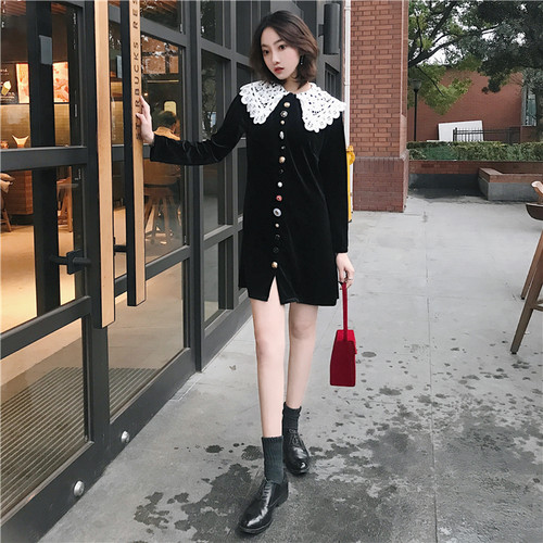 韓国ファッションシンプルベロアワンピースミニ丈aライン ガーリー レース襟